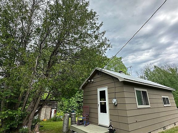 1 room cabin with a wood stove for heat. Has electricity and 2 RV outdoor power hook ups . No septic or drilled well.there is a Non potable well for camper water and there’s drinking water at fire hall down the street. A Gray water drain with campgrounds close by for black water dump. Three sheds for storage, wood and bait. Trail around property for a walk & cross country skiing. We harvested our Christmas tree off property every year. Apple, choke cherry, pear trees, raspberries and morels in the spring.