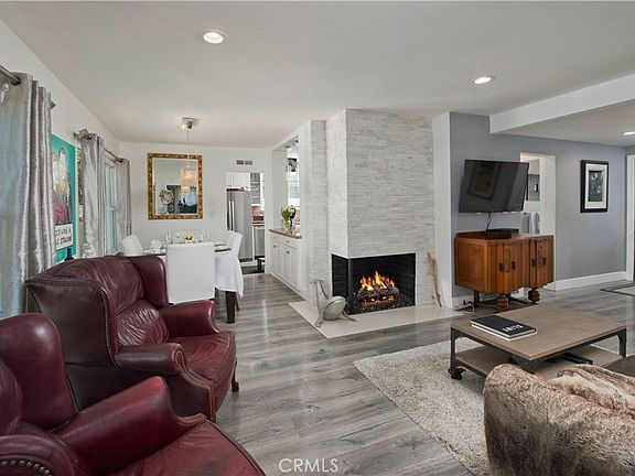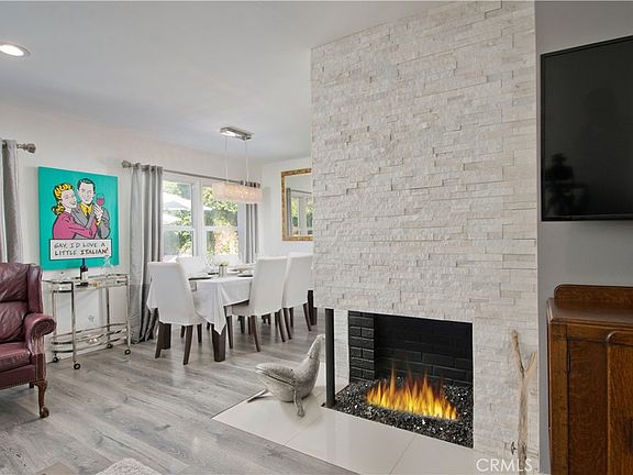 Inside, the home unfolds into a meticulously designed space with three bedrooms and two bathrooms, all adorned with beautiful modern, grey flooring that enhances the contemporary aesthetic. The living room, a warm and inviting space, features a custom gas fireplace, ceiling fans, and tasteful accent lighting, making it the heart of the home where comfort meets elegance.