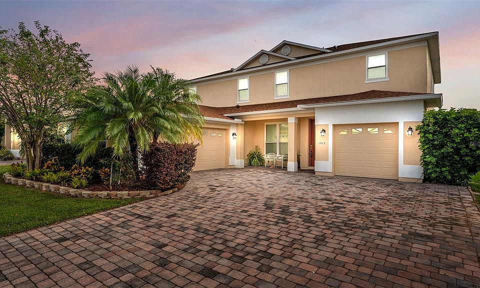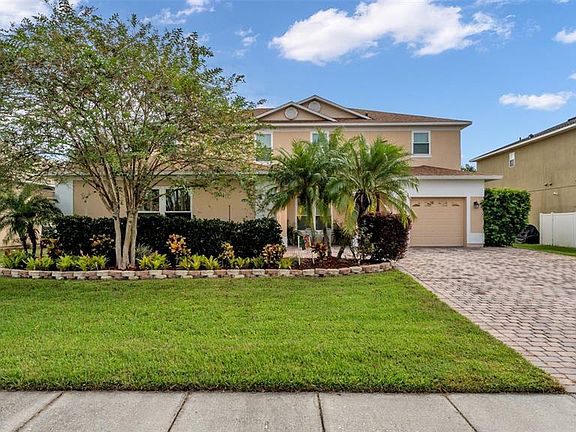 Welcome to this modern and fully furnished five-bedroom, three-and-a-half-bathroom luxury residence, offering the perfect blend of comfort, style, and functionality. From the moment you arrive, the pavered driveway, split three-car garage, gorgeous, landscaped yard, and stately two-story façade set the tone for the sophistication that awaits inside. Step through the front door to find a beautifully designed interior with large-format tile flooring, soaring ceilings, and a thoughtful layout ideal for both entertaining and everyday living. The home features separate formal living and dining rooms, providing refined spaces for hosting, while the open-concept kitchen and family room create a warm and inviting atmosphere for casual gatherings. The gourmet kitchen is a true centerpiece, showcasing granite countertops, a two-tiered breakfast bar, stainless steel appliances, pendant lighting, and a spacious walk-in pantry—perfect for the culinary enthusiast. With a double-primary suite design, the home offers exceptional flexibility. The downstairs suite is ideal for guests or multigenerational living, while the upstairs primary retreat provides a private haven alongside three additional bedrooms, all large in size, and a versatile loft/bonus area—perfect for a media room, playroom, or home office. The laundry room is spacious and fully loaded with cabinetry, a utility sink, and a fantastic tile wall behind the appliances. Enjoy Florida living at its finest on the screened-in lanai with ceiling fans, where you can relax and unwind in comfort and privacy. Immaculately maintained, the roof was replaced in 2023, recently replaced carpeting, the upstairs A/C unit was replaced in 2023, and new windows. Every detail of this home has been thoughtfully curated to provide a move-in-ready experience with timeless appeal. Luxurious, spacious, and impeccably maintained—this home is truly ready to welcome you.