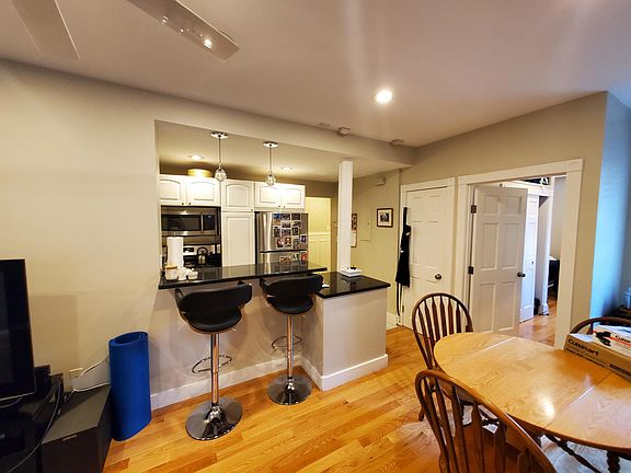 **No Broker Fee** $2,950/month - 2 Bed 1 Bath front to back 1st floor walk out unit in brownstone building - 1 off street assigned parking spot included - Large in unit washer/dryer. - Updated kitchen with SS appliances, granite countertops, dishwasher, disposal, gas stove and microwave. - Bedrooms on opposite ends of unit, both have large closets, queen size beds in each room as pictured. - Recently updated bathroom, including tub/ehower with dual shower heads, linen/storage closet in bathroom - Hardwood floors throughout except tiled kitchen and bath. - Recessed lighting (efficient LED and dimmable/adjustable) and ceiling fans in every room. - Included in rent: water/hot water, trash/recycling, in-unit laundry - 2x (window and freestanding unit) A/C units stay with the unit if desired, - Gas heating and electric paid for by tenant. - Outdoor brick patio space with grill and furniture set included for patio just outside the unit. - Pets allowed with additional fee. Additional information: Beacon St. Brookline address is a great commuter location, steps away from the C & D green line trains, in a mostly owner-occupied small brownstone building. Easy access to St. Elizabeth's and Longwood medical area, downtown and all that Boston, Brookline, Cambridge and the surrounding areas have to offer. Walk the beautiful reservoir or to shops, restaurants, even grocery stores with all the conveniences of Cleveland Circle and Washington square. Unit is a first floor walk out with one direct entrance and one entrance through shared stairwell to the back parking lot. Min 1 year lease required by condo association. Required security deposit and 1 month rent due in lease signing. No Agency Fee. 1st months rent and 1 month security deposit due upon acceptance of application. Min. 1 year lease required by condo association. Tennant pays: Gas heat and electricity Rent includes Hot water, water, garbage/recycling, use of outdoor patio furniture and grill. 1 Assigned off street parking spot included Washer/Dryer in unit at no additional cost Pets allowed with additional fee.