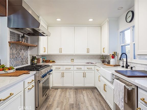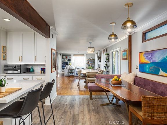 A picture-perfect home on Dover Shore’s coveted Sister Streets, this beautifully maintained Newport Beach haven offers the best in stylish, modern living! Past the gated front yard with a pristine pool and spa, enter a bright, seamlessly connected interior clad in neutral tones, crown molding, and rich redwood flooring. Brilliant sunlight spills across the fireplace-warmed living room and into the chandelier-lit dining area. Impeccably reimagined, the chef’s kitchen equips you with stainless steel appliances, gorgeous cabinetry, a breakfast nook with banquette seating, quartz countertops, and newer Aquaguard laminate floors.