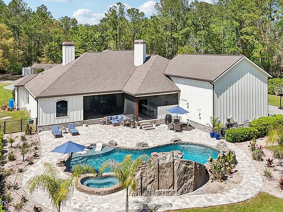Resort style paradise with an outdoor oasis! This stunning builder's custom home is a masterpiece of design, blending indoor elegance with outdoor entertainment. The estate is perfectly situated on 24.26 acres with 1,111 feet of waterfront on Black Creek. The gated entry is lined with Magnolia trees, leading to a modern farmhouse with a French country flair. Step inside and be captivated by the 18-foot vaulted ceiling with exposed beams and the floor-to-ceiling brick fireplace. The heart of the home gourmet kitchen features 64'' double-stacked cabinets, quartz counters, a 6-burner gas range with griddle and double oven, and custom hood. The Butler's Pantry is complete w/butcher block counters, wood shelves, cabinets, and plugs for small appliances. The backyard is an oasis with a heated pool and spa with Grotto lighting, fire torches, waterfalls, waterslide, tanning ledge, and underwater stools, Summer Kitchen, firepit, putting green, RV and Boat parking, workshop EXTERIOR HIGHLIGHTS: