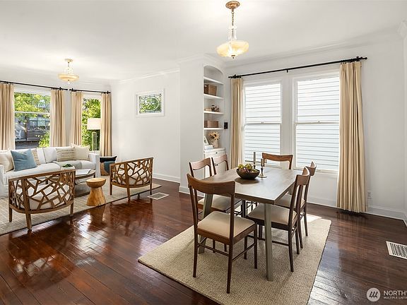 Set along a quiet Capitol Hill street, this exceptionally well-located and effortlessly livable home blends timeless character with modern comfort. Graceful archways, high ceilings, fir floors, and built-in bookcases create a warm, inviting interior. The well-designed kitchen features generous cabinetry and opens via French doors to a private, fully fenced backyard and patio. Upstairs, an airy landing connects three spacious bedrooms, including one with a bay window and custom walk-in closet. Two full baths (both jetted and clawfoot tubs). Fully finished lower level with family room, office, laundry, and outside entry. Large attic. One-car detached garage. WalkScore of 91—just steps to parks, transit, and retail along 19th and 15th Avenues.