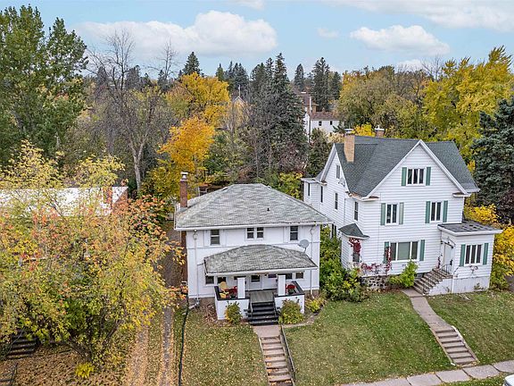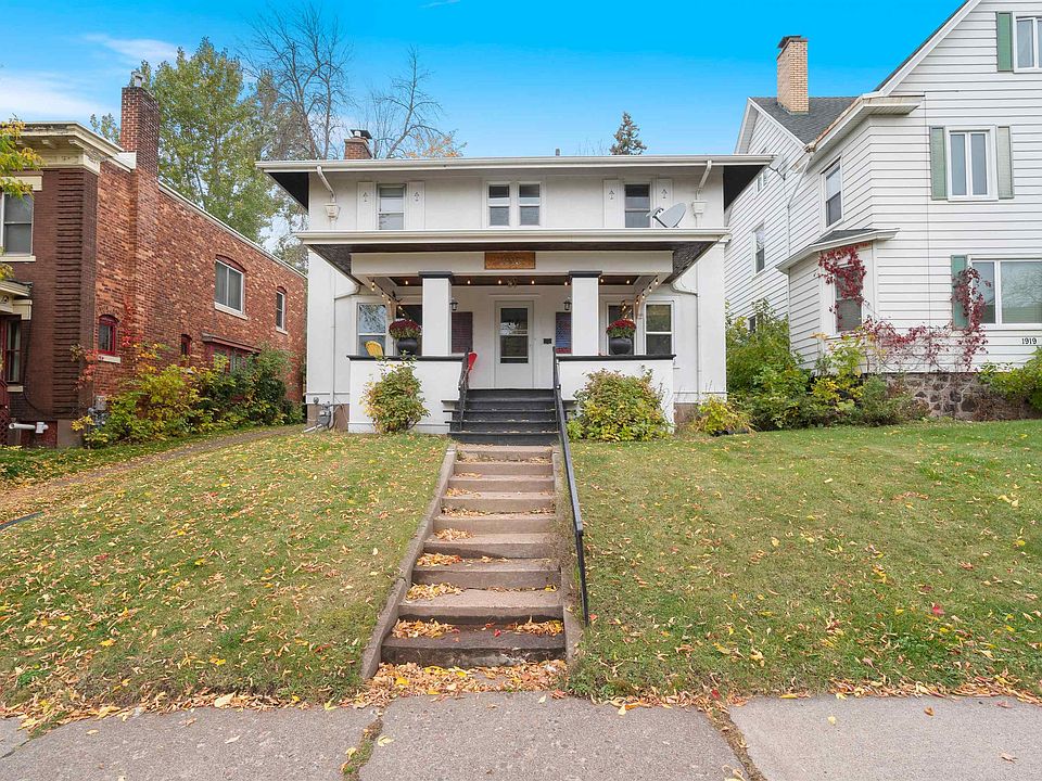 Classic 1925 4-Square Home Near Lake Superior! Beautifully maintained stucco home on the eastern edge of downtown Duluth. South-facing and filled with natural light. Features include gorgeous maple flooring throughout, original woodwork, and a wood-burning fireplace. Updated kitchen blends modern convenience with classic style. Three bedrooms and one full bath upstairs; unfinished basement offers expansive shop areas, laundry, and a half bath plumbed for a shower. Enjoy outdoor living on the charming front porch, spacious backyard patio, and large yard with room to build a garage if desired. Driveway provides ample parking for several vehicles. Convenient location—just blocks from Lake Superior and the lakewalk, and close to grocery stores, banks, Park Point, and downtown amenities. Highlights: 3 Bedrooms / 2 Baths (half bath plumbed for shower in basement) Updated kitchen with newer windows Original woodwork and maple flooring Wood-burning fireplace Expansive workshop areas Large yard with patio and off-street parking South-facing, steps to Lake Superior