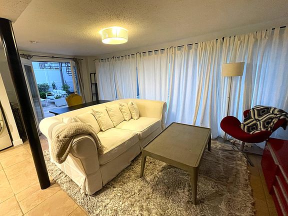 This newly remodeled, fully furnished one bedroom, one bathroom pool house includes a living area, dining area, and a kitchen with standard appliances, dishwasher, disposal. Tile flooring in the living room, kitchen, bathroom and hardwood flooring in the bedroom. Inside features includes 2 A/C units, in-unit washer/dryer, and big wall closets for additional storage. Linens, kitchenware, and TV included. Outside features include pool, patio, mature trees, fenced backyard, garden, balcony, barbecue area with a grill, and on-street parking. All bills included in monthly rent. Short term leases available. Pets are considered.