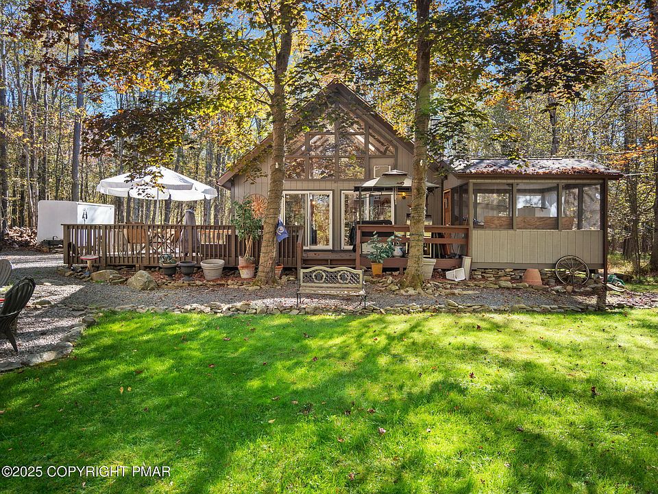 Located in the desirable, gated community of BIG BASS LAKE, w/just about every amenity you can think of! This home has 3 spacious bedrooms, 2 full, modern bathrooms (one on each level) & is ideal as a 4-season home or the PERFECT AIRBNB! It sits on a half acre lot, is walking distance to the Clubhouse, outdoor pool, courts and splashpad, has been well-cared for by its present owner & is TURN KEY ready for its new owner. This modern A-frame home will make all of your guests feel right at home as soon as they arrive. This home offers a 35,000 btu HVAC mini split system (heat & AC) for the open concept layout of the kitchen, living room & dining area (in addition to baseboard heating & wall AC units in every room), space for up to 8 cars on the driveway (recently re-stoned), hardwood flooring throughout, washer/dryer on main level, large wrap-around deck, sunroom, fire pit, storage shed etc. Whether you enjoy snuggling in front of a warm fireplace in the winter, sitting around a fire pit in the fall, outside on the deck in the spring, or poolside in the summer, this is the home for you! DON'T DELAY-SCHEDULE YOUR APPT TODAY!