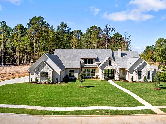 Experience refined one-level living in this beautifully designed new construction home located in Legacy Bend, South Tyler’s newest gated luxury community adjacent to the neighboring Hollytree Golf Course and Country Club. Thoughtful in layout and refined in finish, this home delivers approachable luxury with a warm, organic design aesthetic. An open floorplan creates effortless flow for everyday living and entertaining, with wide-plank white oak flooring grounding the space in natural texture. The great room features soaring ceilings, a stunning stone fireplace, and expansive windows that invite in natural light and frame peaceful backyard views. Designed to be both functional and beautiful, the kitchen showcases authentic soapstone countertops, custom cabinetry, a large gathering island, and a walk-in pantry—perfect for those who value elevated finishes and intentional design. The dining space connects seamlessly to the great room and outdoor living, creating an easy atmosphere for hosting and connecting. This home offers 4 spacious bedrooms, 3 full bathrooms, and a powder bath, along with a private office ideal for working from home. A separate game room adds flexible living space for media, play, or hobbies without sacrificing style. Outdoor living is exceptional, with an oversized covered patio featuring a stone fireplace and built-in outdoor kitchen ready for year-round enjoyment. The large lot provides room for a future pool, gardens, or outdoor recreation. Every detail was thoughtfully selected, with a soft palette of earth tones, natural stone, organic textures, and timeless finishes that create a sense of calm and connection. Located just minutes from upscale dining, shopping, and medical centers, this home balances luxury living with everyday convenience in one of Tyler’s most desirable areas. Luxury, thoughtfully done, and built for real life.
