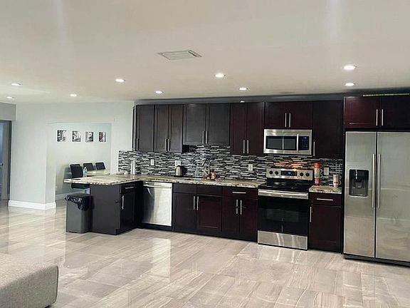 Tropical pool and backyardTop finishesFully renovated pool homeLights up at nightDecor tile flooringStainless steel appliancesModern furniture