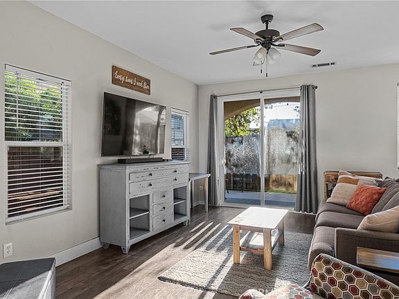 Step inside to the inviting living room with laminate flooring, large windows, a ceiling fan, and a cozy fireplace. A sliding glass door leads to the backyard, while the open-concept flow connects seamlessly to the kitchen and dining area. Here you’ll find a chandelier, tiled floors, granite countertops, stainless steel appliances, and wood cabinetry, all bathed in natural light.