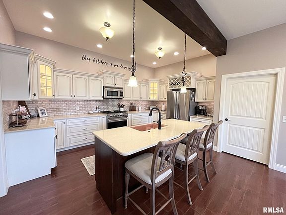 This gorgeous 5 bedroom, 4 bath home sitting on the outskirts of Herrin has over 4200 sq ft and features a great family oriented layout. The large kitchen has top of the linematching Viking appliances, walk-in pantry and an island that opens up to the dining. Relax by the fireplace in your cozy living room with built-ins and exposed beam ceilings. Also downstairs you will find a bedroom, the laundry room and an office with lots of natural light and built-in shelves. Upstairs features a game/bonus room, 4 more bedrooms including a beautiful master suite with tray ceilings and a master bath w/ custom tiled shower with his and her vanities and closets. Step outside on your large Trex deck with a heated hybrid pool, firepit and an outdoor kitchen. There is a full man cave in the detached garage both heated and cooled w/ spray foam insulation, and a custom bar! All this sitting on almost 3 acres! Many upgrades including an encapsulated crawl space, built in surround system, solar , geo thermal , whole house generator and much more!
