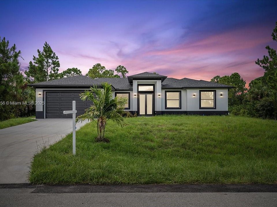 Just completed 2025 new construction on ½ acre in Lehigh Acres—no HOA and move-in ready! This 3 bed + den, 2 bath home features a bright open floor plan with impact-resistant windows and doors, full porcelain tile throughout, and stainless steel appliances. The modern kitchen offers a large island, soft-close cabinetry, and overlooks the spacious living and dining areas filled with natural light. Split-bedroom layout provides privacy, with a luxurious primary suite featuring a walk-in closet and double vanity bath. Also includes water softener, alarm system, and oversized 2-car garage. Enjoy a large lot with plenty of space for a pool, RV, or boat. High-end finishes, quality construction, and room to grow—why wait to build?