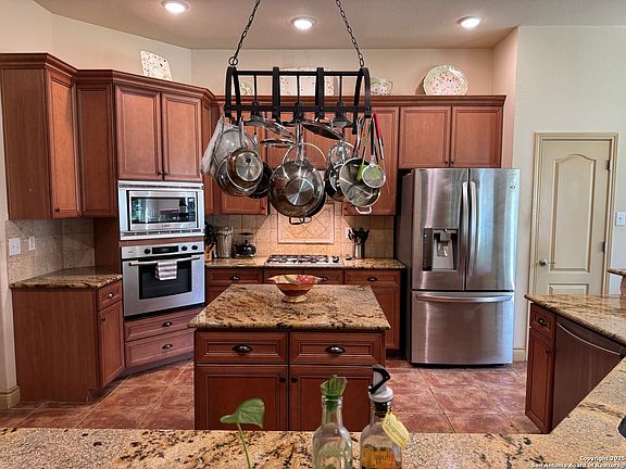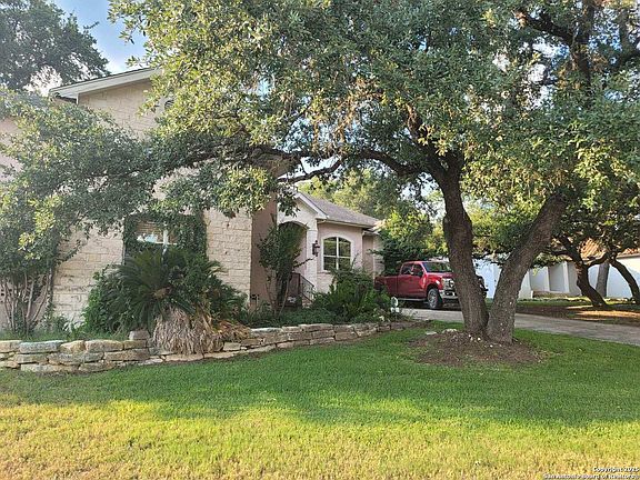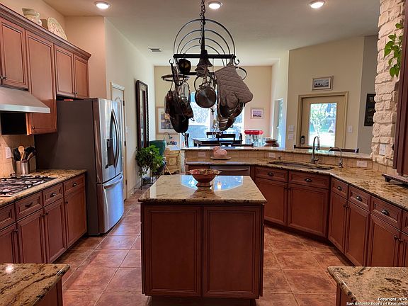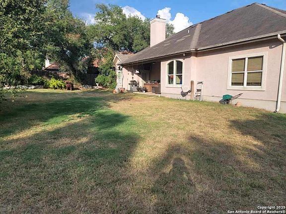 Experience the charm of Texas Hill Country living in this 2,806 sq. ft. home on a 1/2-acre lot with mature trees. Featuring 3 bedrooms, 2.5 baths, and a private study, this home offers high ceilings, tile and wood floors, and stone accents throughout. The open living area with a cozy fireplace flows into a spacious kitchen with Bosch appliances, granite countertops, center island, and breakfast bar. The primary suite boasts an executive bath with whirlpool garden tub, separate shower, and a generous walk-in closet. Relax on the covered patio with hot tub overlooking the sizable backyard, where deer and seasonal birds are often seen. The oversized garage accommodates 2 cars plus a motorcycle, with built-in shelving for storage. Built in 2004, this warm and welcoming home invites you to enjoy both comfort and style in a serene setting.