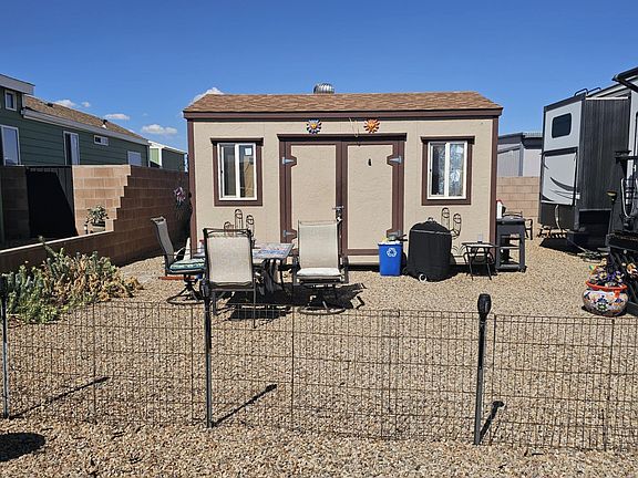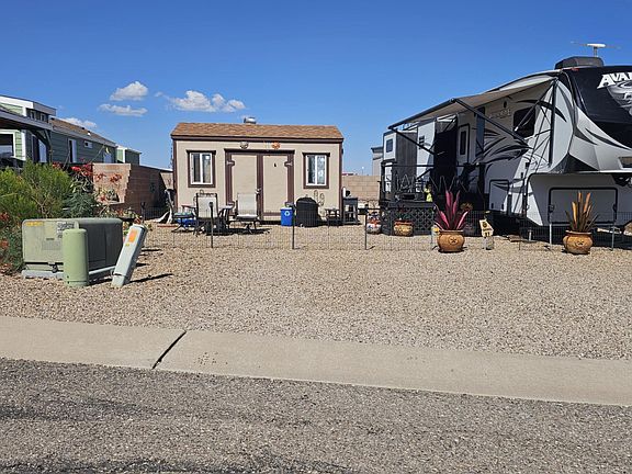 Arizona Legends, a welcoming 55+ community, offers outstanding amenities including a clubhouse, fitness center, library, laundry facilities, pool, and spa. With water, sewer, and trash included in the low $85/month HOA fee, it's an affordable and hassle-free lifestyle. This lot includes some outdoor furniture and a 16'x20' shed with power and water a Washer and Dryer with room to store all of your things.
