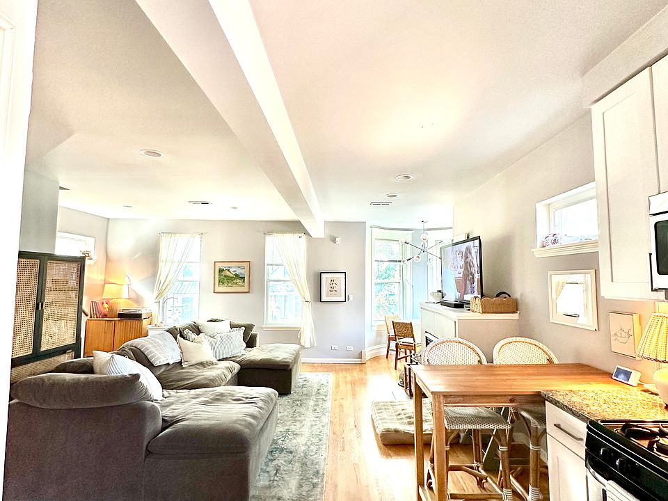 Light & bright Sunny 3 bedroom with 2 brand new white tiled baths and kitchen. Quite 3 flat in the best block of Roscoe Village. Wide open kitchen to Living room area. Great place to entertain. Working from home will be great while you have your coffee in the sunroom or in the turret room in the bedroom. Hardwood floors, in unit laundry, gas fireplace, kitchen with black and stainless steel appliances. Lots of storage in the dry basement. This will not last- request a showing now!