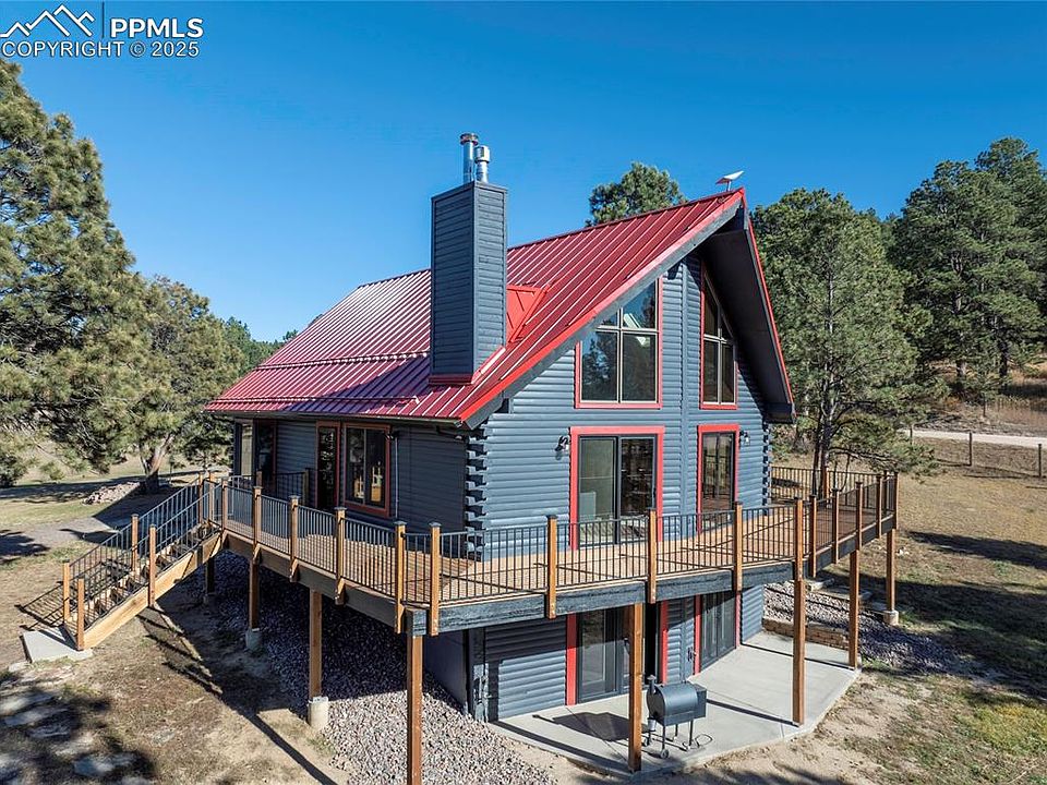 Arrive at this custom log home to curated colors, an elevated wraparound deck, and a 36-tree orchard still in training—destined for pies, preserves, and bragging rights—framed by trees and open pasture. Set on 5+ acres, this equestrian-friendly retreat delivers space, privacy, and true Colorado living—mountain views, quiet skies, and room to roam. The oversized 40×24 workshop with 12-ft RV door handles toys, projects, and storage; plus, RV parking (with RV dump), fenced pasture, vegetable garden, and gated entry. A matching chicken coop is ready—bring your hens and enjoy farm-to-table living (omelets on standby). Meticulously maintained, the home features a new metal roof, new exterior paint, and a new deck. Inside, luxury and rustic charm blend stone tile, granite counters, and rich hickory cabinetry to anchor the remodeled kitchen. Every space was thoughtfully designed, from updated baths to warm log details that make this home truly one-of-a-kind. Vaulted ceilings and floor-to-ceiling windows brighten the great room, while skylights and a wood-burning fireplace set the tone for cozy evenings. Three thoughtfully designed levels suit work-from-home owners, growing families, or retirees who want elbow room. The walk-out basement adds flexibility with a gas fireplace, bedroom/office, full bath, and a large open area for a gym, rec room, or guest retreat. Outside, enjoy rural living with real convenience: a young orchard with apples, cherries, pears, plums, and peaches, a productive garden, and a lush hop trellis. This property sits in a friendly, livestock-welcoming community and is served by award-winning Lewis-Palmer School District 38. This home blends craftsmanship, comfort and Colorado beauty with acreage, animals, and a peaceful cul-de-sac setting with mountain views—rare value, beautifully delivered.