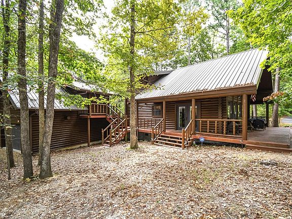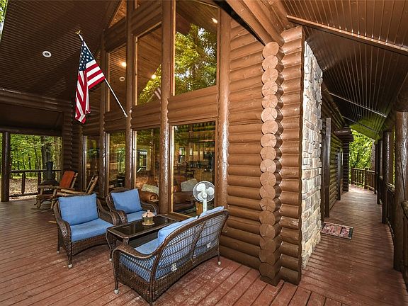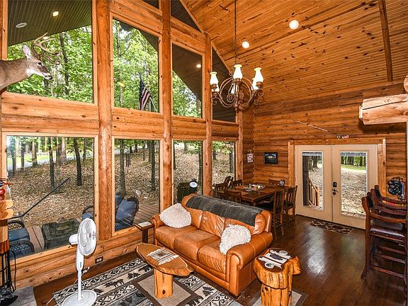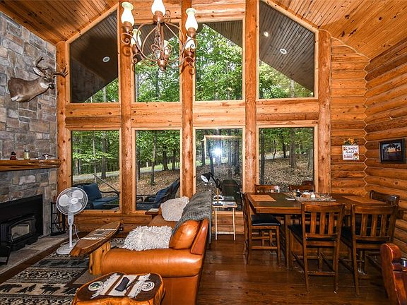 Flint Ridge Resort- The Forester hand-crafted log home w/annex bunk house is 1554 SF combined 3 bdrm 3 bath offers a uniquely fully furnished Turn-Key Escape w/garage. Roof overhangs custom picture windows, wrap-around deck to the back for entertaining. Encompassing 4-acres located in the heart of the Ozark foothills, pristine fishing on Upper Illinois River, community lakes where ATVs are a way of travel, golf course all in this gated community. Paved street and fiber optic!