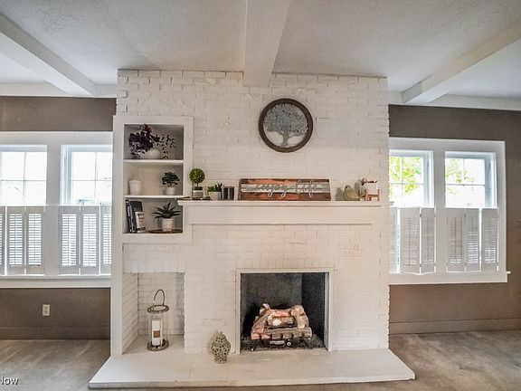 Inside, the light filled living room features a beamed ceiling, a cozy fireplace with wood storage and display shelves, and plenty of space to gather. The formal dining room highlights crown molding, chair rail, original cabinetry, and a chandelier that adds classic charm. A bright, fully applianced kitchen with glass-front cabinets and a breakfast nook blends vintage appeal with everyday convenience.