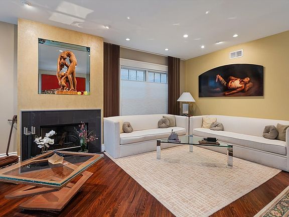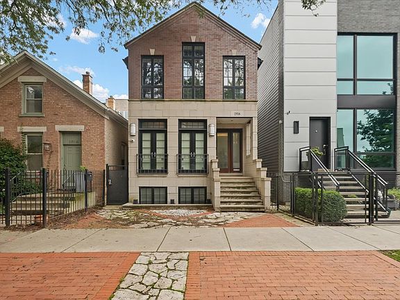 On the market for the first time, this custom Bucktown residence is tucked away on a peaceful street that is a 5 minute walk to both the Western Blue Line and the 606 / Bloomingdale Trail. The main level impresses with diagonally laid hardwood floors, intricate millwork framing the windows and doors, two fireplaces, and a dramatic staircase accented by glass panels and a two-story glass block wall that floods the space with natural light. The living room is anchored by French doors opening to a Juliet balcony, while the front and rear of the home are separated by a clever double-closet hallway and a jewel-box powder room featuring leather-studded walls. The open-concept great room combines kitchen, dining, and sitting areas - complete with espresso-colored custom cabinetry, a fireplace, striking light fixtures, and access to a small deck. The L-shaped kitchen showcases sleek black granite, a brand-new gas cooktop island, wall oven with convection, separate GE Advantium halogen oven, and an oversized pantry. From the deck, stairs lead to the garage rooftop, prepped with lighting and electricity and ready to become your future urban oasis. Enjoy the rare convenience of a hallway with direct access to the 2 car heated garage. The second floor skylights pour light into the cathedral-ceilinged hallways. A full-sized laundry closet makes wash day effortless. The primary suite stuns with an entrance hall lined with a walk-in closet on one side and a spa-like bath on the other. Floating cabinetry, dual shower heads, and soaring ceilings elevate the ensuite, while the oversized bedroom offers cathedral ceilings and French doors that open to potential for a future balcony or catwalk to the garage rooftop. Two additional bedrooms and one additional full hall bathroom all feature cathedral ceilings, generous closets, and abundant natural light. The lower level is finished with porcelain tile floors, high ceilings, large windows, and a full bathroom, the basement's front section is ideal as a family or media room. The rear section, once used as a business office, can easily transform into a massive bedroom, in-law suite, or creative live/work space with its own wet bar and private entrance. Modern conveniences include central vacuum, built-in flush-mount speakers, a home security system with cameras, dual-zoned furnaces, heated floors in the basement and primary bath, and recessed lighting throughout. The location is unbeatable - directly across from Ehrler Park and near Holstein Park, with neighborhood favorites like Floyd's Pub, Irazu, Margie's Candies, and independent coffee shops just steps away. Commuting is effortless with nearby public transit, the Clybourn Metra, and quick access to I-90/94.