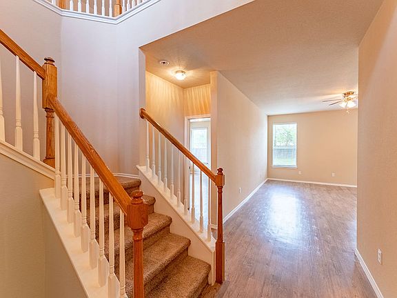 The main living area is bright and welcoming, featuring rich wood-look flooring. The kitchen offers ample counter space and pantry. Upstairs, you'll find three well-sized secondary bedrooms with plush carpet, plus a full bathroom and access to the expansive loft space.