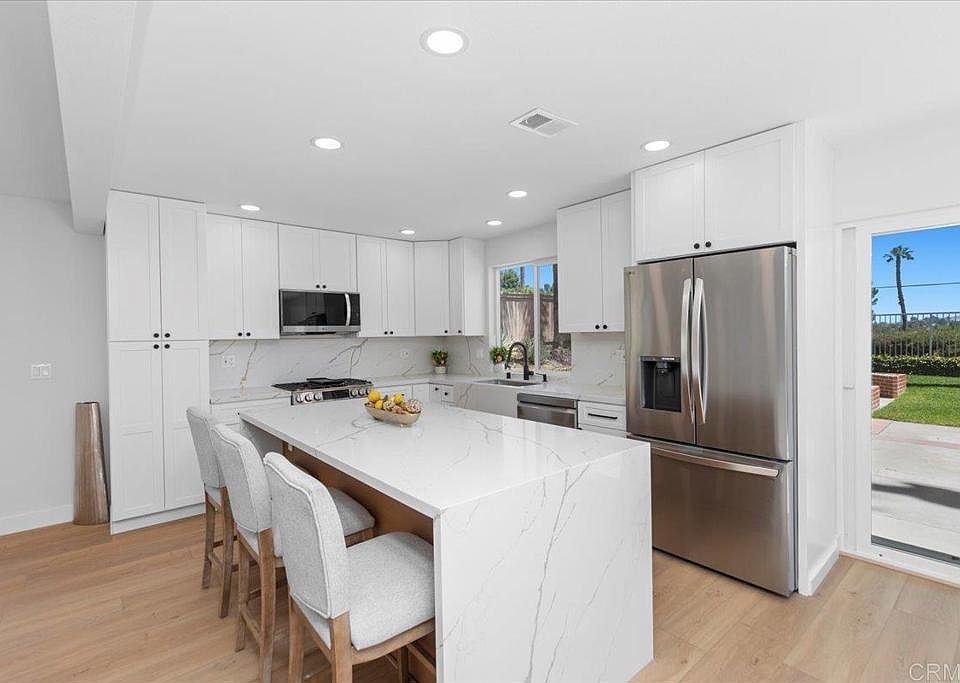 Enjoy the cool breeze and views in this remodeled 3 bedroom + loft home in a desirable gated community in Vista. This open concept home is filled with natural light with vaulted ceilings and designer finishes. The main level offers a living room with fireplace, dining area, and an upgraded kitchen with waterfall island that looks out to the backyard and open space. A convenient half bath completes the downstairs floor plan. Upstairs, a flexible loft adds space for a home office, media area, or playroom. The large primary suite includes a beautifully updated ensuite bathroom, while two additional bedrooms share a stylishly renovated hall bathroom. Take advantage of the gated neighborhood, a community pool, and a prime location near shopping, dining, schools, and commuter routes.