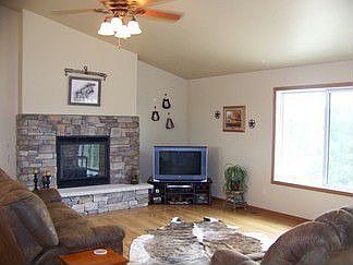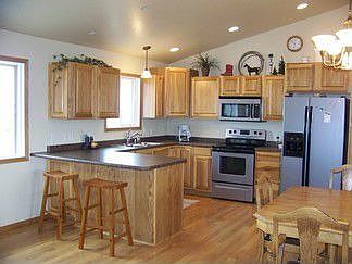 Lovely new home over-looks a wooded draw. Located west of Belle Fourche, SD in a rural area with pine trees and wildlife. 4 bedroom, 3 bath home with wood floors in kitchen, dining & living room, heated tile floor in masterbath. 3160 sq. ft. Exterior concrete is colored & stamped. Quality home with particular attention to detail.