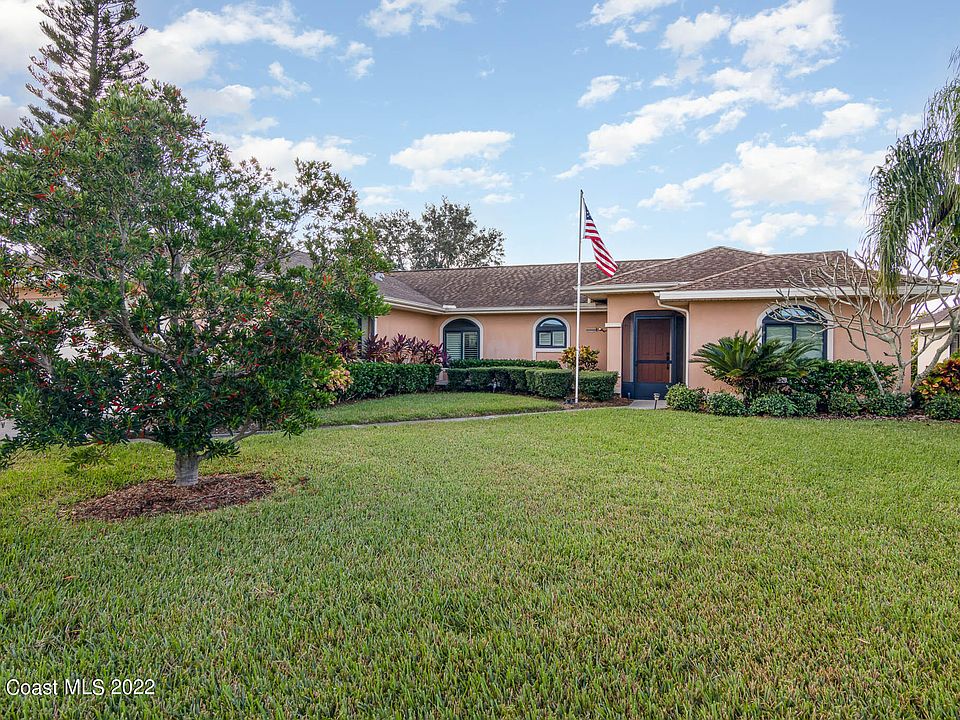 Lovely, light and bright extended waterfront Raleigh model, located in a military, country club community. Vaulted ceilings and an open floor plan which includes formal living and dining areas along with an enormous Florida room. The updated kitchen overlooks living and dining areas, includes a breakfast nook, granite counter tops and tons of cabinets. Owner's suite boasts two walk-in closets, double-sink vanity with granite and a roll-in shower. Plantation shutters, high impact storm windows and doors, new lanai screening. New roof being installed. This is a WOW location! Home to over 600 Military Veterans, Indian River Colony Club is a Private 55+ Country Club community with an extensive maintenance program for each home, an 18-hole golf course, fine dining restaurant with an executive chef & the 19th Hole restaurant and bar, fitness center, heated swimming pool, tennis courts, croquet, bocce ball, shuffleboard, pet-friendly, gated community with over 40 activities groups that have you feeling like you are on vacation.
