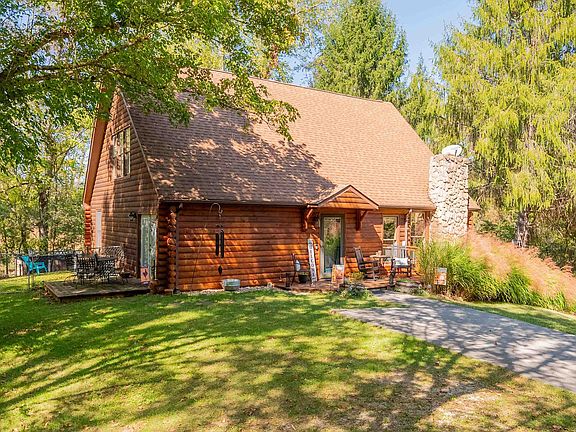 Step into the warmth and charm of this cozy 2 bedroom, 2 bath log cabin retreat on 1.75 private, tree-lined acres just 1.5 miles from Prices Fork and Moon Hollow Brewery. Classic log siding, a stone chimney, fenced yard, shed, welcoming front porch, expanded decking, and hot tub create the perfect outdoor oasis to relax while observing area wildlife. Inside, enjoy a gas fireplace, open floorplan, main level bedroom with private deck access, den/office, and upper-level primary suite with private bath and large closets. Recent updates include exterior sanding/restain, new fence & new HVAC (2022), gas fireplace serviced (2024), new water heater & septic pump/inspection/updates (2025). Dual-zone heat pump adds comfort year-round. With rustic charm, modern updates, and a tucked-away setting, this home is ideal as a year-round residence or peaceful weekend retreat — offering privacy and convenience. Easy NRV travel - just 14 minutes to VT, 16 minutes to Christiansburg & 20 minutes to RU.