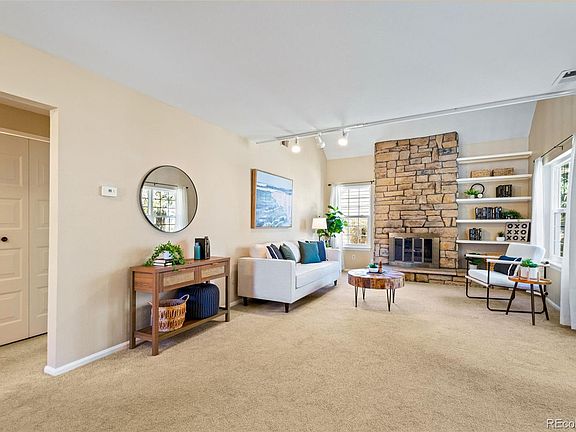 Your oasis awaits in this move-in-ready 2 Bed/2 Bath end-unit townhouse at Cobblestone in Heather Ridge! Upon entering, you are drawn to the high vaulted ceilings and the stunning stone fireplace that spans from floor to ceiling in the open-layout living room. The built-in shelves offer the perfect place for your library, collections, or storage. Adjacent to the living room is an area that can serve as an extension of the living space or a dining area. Next, you will find the bright kitchen, which provides ample room to move around easily while preparing your favorite meals, along with a fantastic spot for a breakfast nook. A large bedroom, a full bathroom, and a laundry area complete the main level. The entire upstairs is dedicated to the open and airy owner's suite, offering endless possibilities in this spacious and unique area. A large cedar closet and an ensuite with a relaxing soaking tub make this owner's suite a true sanctuary. New windows throughout, offer energy efficiency and abundance of natural light. Step outside and enjoy quiet evenings on the patio, a stroll to the golf course or cool off in the community pool. With many dining and shopping options nearby, this location provides easy access to the light rail, the highway and the Heather Ridge Golf Course.