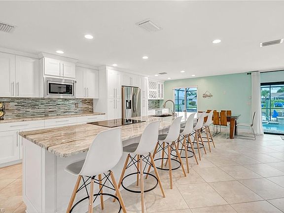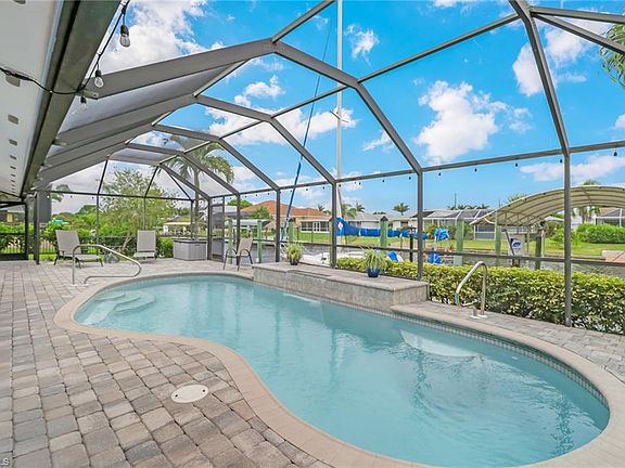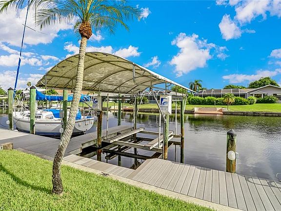 Immaculate DIRECT SAILBOAT ACCESS home in desirable SE Cape Coral Savona neighborhood. This gorgeous home has been made nearly new, comes furnished and is waiting for you to dock the boat and enjoy paradise! The open floorplan will impress immediately. 14 foot long quartz top island provides ample seating and entertainment space. Kitchen also features stainless steel appliances (new refrigerator), vibrant white soft close cabinets and drawers, tile backsplash, built in pantry and dry bar with wine rack and wine cooler/mini fridge. The entire center of the home invites natural light and stares over the pool area and water view. NEW ROOF in 2021 with brand new IMPACT WINDOWS AND SLIDERS! Newer 50 gallon water heater. Lush tropical landscaping throughout the property and the backyard is simply an oasis. Beautiful SALT WATER pool and paver lanai area offers plenty of lounge space both in and out of the sun. Brand new pool water feature recently upgraded. The composite deck captains walk/dock area is a boaters' dream including a 10k lb. boat lift and canopy cover. Laundry room upgraded with white upper cabinets for additional storage. Home comes furnished and ready for you to call home!