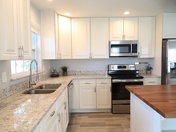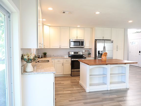 Walk into a home where every detail has been thoughtfully updated with quality materials. The kitchen anchors the living space with floor-to-ceiling white shaker cabinetry featuring soft-close hinges, granite countertops, and a large center island perfect for meal prep or casual dining. Stainless steel appliances and recessed lighting complete the clean, modern aesthetic.