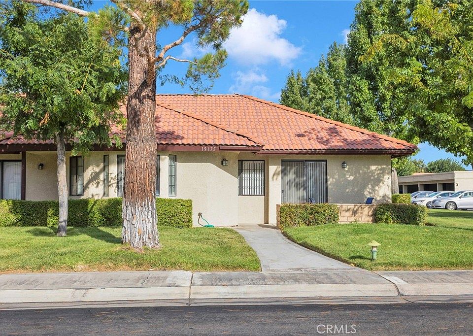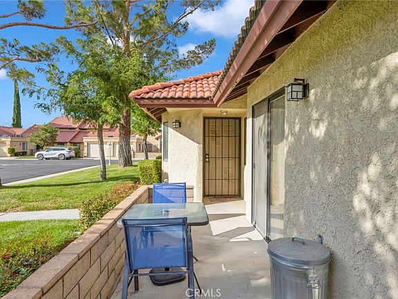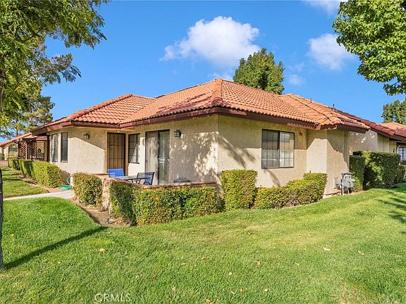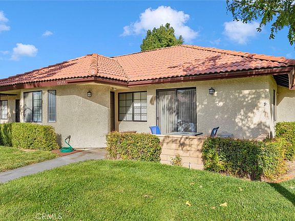 WELCOME to this move-in ready Condo located in Jess Ranch, Premier 55+ gated communtiy. Features 2 bedrooms and 2 bathrooms, including a spacious main suite with walk-in closet, linen closet, and French doors leading to a private patio. The living room boasts a stunning wood beam cathedral ceiling, while a mirrored dining wall adds elegance and light. Fresh paint, newer HVAC, tile and carpet flooring, plus a stackable washer & dryer provide comfort and convenience. Carport with storage nearby. Enjoy community amenities including clubhouse, pool, spa, gym, golf course, social activities, and 24/7 security. Well cared for and welcoming. This home offers the perfect blend of style, comfort, and active senior living.