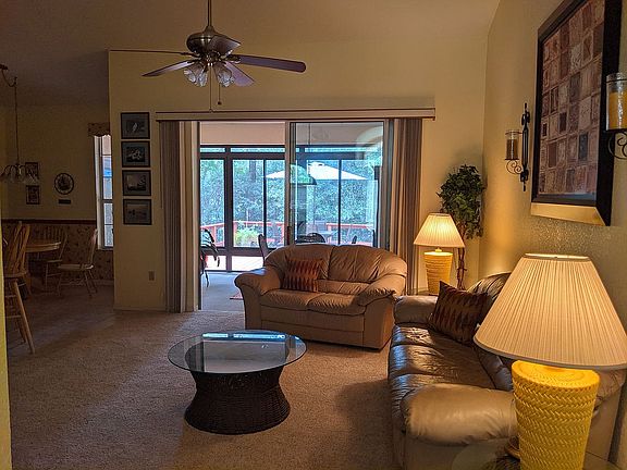 What a fantastic home which has 3 bedrooms, 2 full bathrooms, open kitchen (granite tops), nook, family room (all with vaulted ceilings), dinning room, beautiful lanai and a 16x20 pressure treated deck off the lanai (built in 2020). Master bedroom with trey ceiling, walk-in closet, master bath with oversized shower and garden tub. Newly carpeted throughout the house and lanai. This is a great home if you love the outdoors. Less than 1 mile to KP Hole Park, 2 miles to Rainbow Springs State Park and Blue Run of Dunnellon Park. Shopping and religious facilities with in minutes. Also you are less than 30 minutes to Crystal River and the Gulf Coast of Florida. This is a very well maintained community, friendly neighbors and beautiful wild life. This house is fully furnished and you have the option to purchase.
