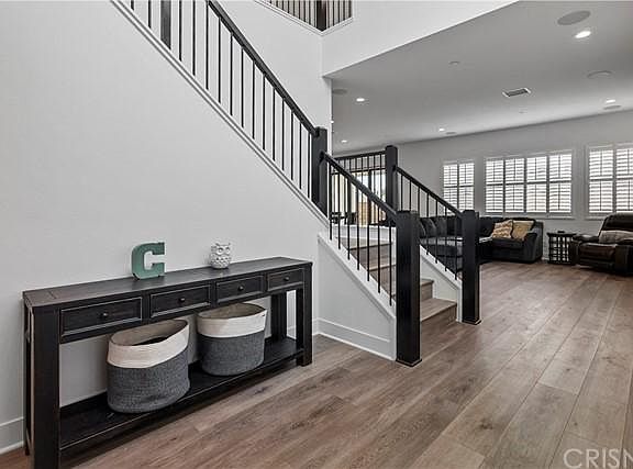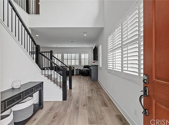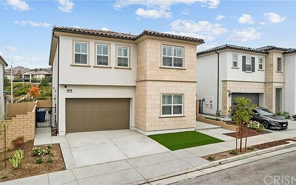 Don't miss this custom five-bedroom, four-bathroom pool home located in a highly sought after gated community called Victoria at Plum built by Toll Brothers in 2021. This home has an incredible open floor plan with a remodeled custom chefs' kitchen that includes two pantries, a large center island that looks out to the living room, dining room and the back yard. The living room is very spacious with a beautiful custom fireplace and surround sound for entertaining guests or for those relaxing nights. You will also find a bedroom and full bathroom downstairs for mom and dad, out of town guests or those in-laws. Upstairs there is a spacious open loft, a large master bedroom with a patio to look at those mountain views, an updated en-suite with a custom two sink vanity and enormous custom shower space with dual shower heads and most importantly a large custom closet. Also, there are three additional bedrooms upstairs, one bedroom has its own bathroom and the other two share a jack and jill bath. The home has OWNED SOLAR, property has been wired for security, has a tankless water heater, a beautiful brand-new pool and the property has just recently been landscaped. HOA amenities include, pool, cabanas, and BBQ's, this home is walking distance to shopping, dining, and coffee shops. If you want new construction in the Saugus school district but do not want the wait, don't miss this opportunity!