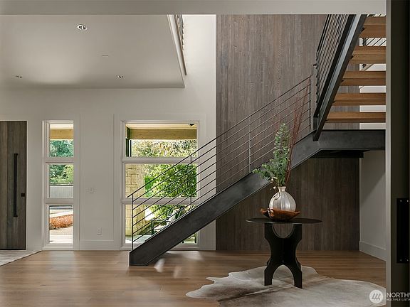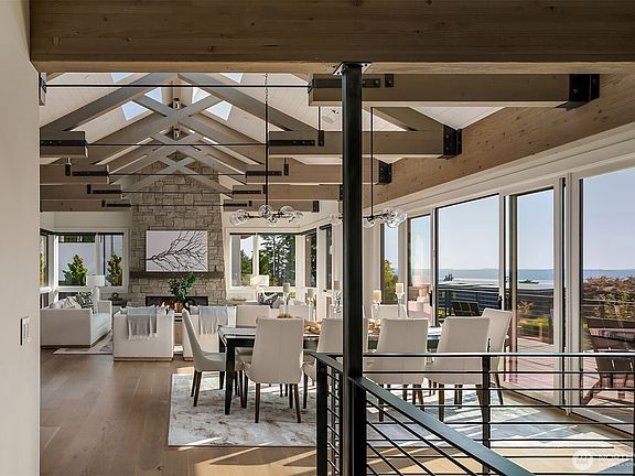 Perched near the peak of Clyde Hill, this fully gated estate by Adam Leland Homes was custom-designed to maximize the protected southwest views towards Lake Washington. An entertainer's dream with circular driveway, open concept living, expansive covered outdoor space, gourmet kitchen, wet bar, and wine cellar. Luxury amenities include two primary suites, 3 fireplaces, cedar sauna, steam shower, elevator, 4-car garage, 3 powder rooms, and an infinity edge spa. The layout features a theater/media room, flex space, rec room, office/den, and dramatic architectural details with exposed steel and wood beams, and a stunning floating staircase. 360-degree security cameras, state-of-the-art home automation, and access to award-winning schools.