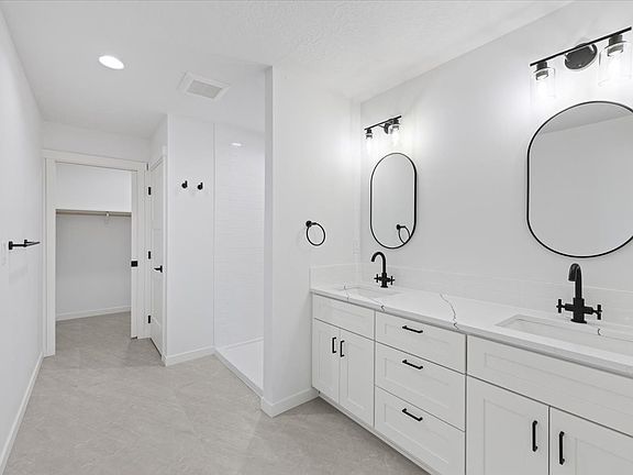- Bathrooms with dual vanities, modern fixtures, and tile showers