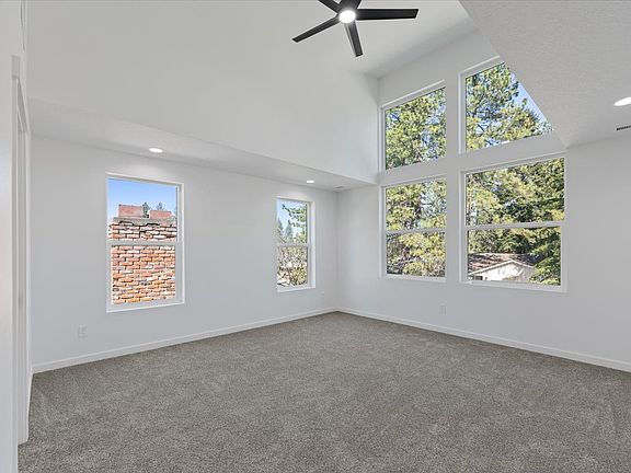 - 3 carpeted bedrooms, including a primary suite with vaulted ceilings and oversized windows