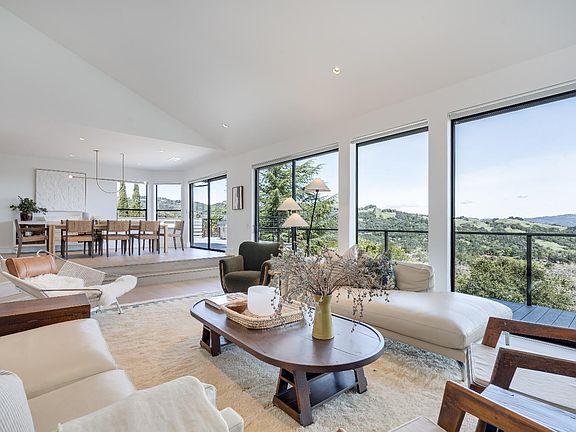 Perched on 5 acres atop Sonoma Valley's rolling hills, less than an hour from SF, this 4-bed, 3.5-bath home is a private retreat. This custom home has views from every room and showcases thoughtful details with new wide-plank oak floors, floor-to-ceiling windows, custom built-ins & new A/C. The finishes by Goldenbird Design reflect the changing hues of the Sonoma sky. The expansive great room has soaring ceilings and a stunning oceanic limewash accent wall and flows out to two levels of decks. The chef's kitchen has professional appliances, custom cabinetry & an eat-up bar plus a breakfast area. The dining area flows onto an outdoor deck with a BBQ & views. The primary bedroom offers calming earth-toned neutrals, a walk-in closet and a spa-like bath with a soaking tub, walk-in shower, towel warmer & a private deck w/ down-valley views. A private ensuite for guests, laundry room & powder room complete this level. Downstairs w/ great room, 2 guest rooms, a bath & storagge. Water filtration. 3-car garage pkg + much more. The landscaped yard features a heated pool & ample lounge space. Diamond A has a great community & offers walking/horse trails, rec center with events, pickleball, tennis, pool, park, + more! 10 mins from Sonoma Square & wineries.