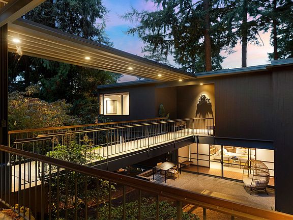Coveted Enatai location near to Bellevue's best schools, dining, entertainment and all West Bellevue offers! A masterpiece of mid-century modern designed by renowned architect Omer Mithum; generous use of exceptional materials creating a perfectly balanced floating oasis. Structural steel is used throughout - including exposed in interior 10' ceilings through out the main level, supporting cantilevered entrance and multiple entertaining terraces. West facing home with phenomenal Lake Washington and Seattle City Views. Main level primary suite with gym or office. Additional large lower level room possible 4th bedroom. Quick freeway access- pivot anywhere! Newly installed HVAC, lawncare included. Home is offered unfurnished.
