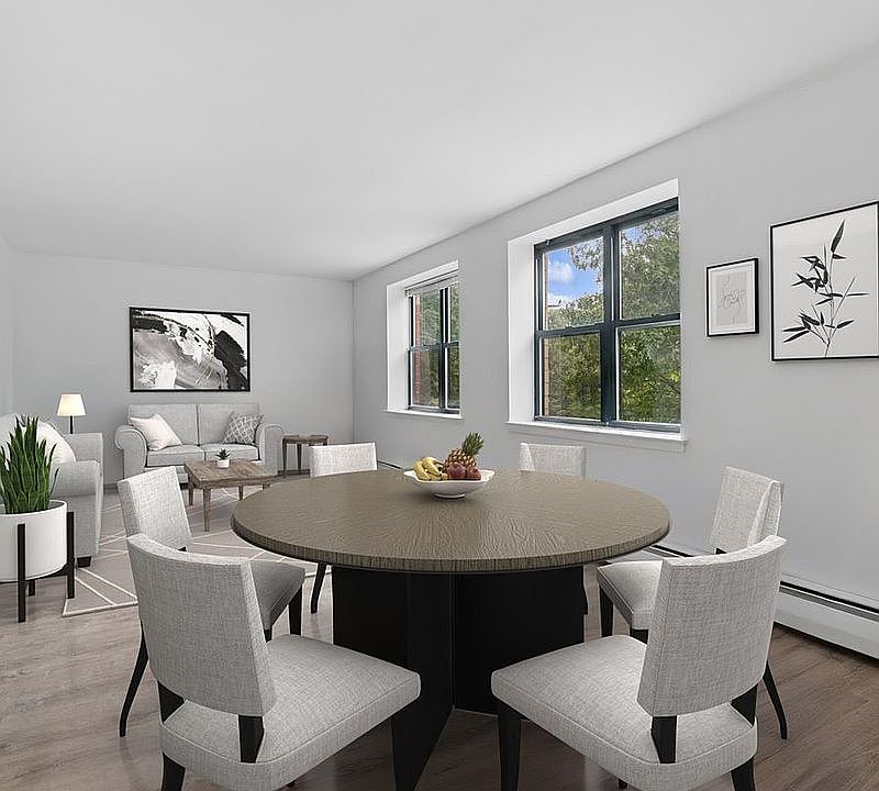 Upon entry, you're greeted by generous room proportions, beginning with a gallery wall and double-deep closets. The open dining and living room layout welcome abundant northwestern light, creating an airy feel. Storage is plentiful, and luxury vinyl flooring combines durability with style.