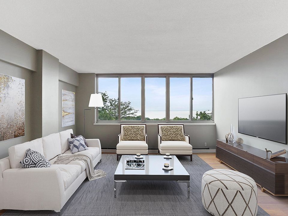 Bonus! Seller offers 3 mos condo dues with accepted offer! Wake up to the wonder of Lake Michigan every morning thru your living room windows. Living room boasts pergo type wood-look floors. Platform can be removed. It was installed to elevate furniture for optimum views. Kitchen has been updated-it offers ample prep & storage space. Guest half bathroom has been refreshed as well. Two spacious bedrooms with generous closets. Throw your next party on the rooftop solarium with spectacular views of Lake Michigan & the entire city