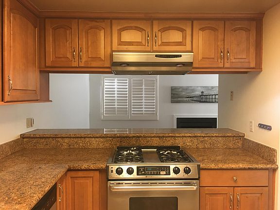 Highly sought after condominium with wrap around deck in the quiet gated Pier Pointe community! Ideal location less than 2 miles from the beach and minutes from downtown Huntington and Huntington Central Park. Don't miss out on this opportunity to live the Surf City Lifestyle! This unit has many high quality upgrades throughout. Remodeled kitchen boasts rich cherry custom cabinets, ceiling fans, plantation shutters, wood laminate living room floors, granite counters and breakfast bar, travertine kitchen floors and stainless appliances. The bathroom has an updated vanity and sink, custom cabinets, and travertine floors. The detached one car garage has a vaulted ceiling with abundant storage. Water, trash, Internet, and cable tv are included. Tenant responsible for gas and electric utilities. No pets allowed. This is a non-smoking community.