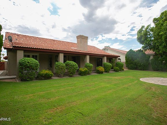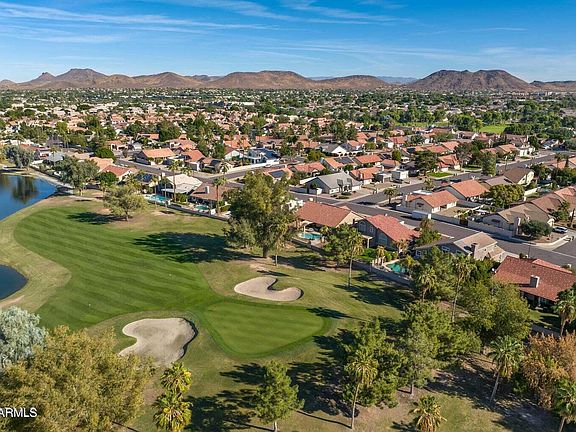 Outstanding Arrowhead Country Club golf course lot nestled near the back side of the 13th green shaded by mature trees creating excellent views through block/wrought iron fencing. Gorgeous landscaping front and back featuring 48' tiled roof covered patio with 5 stucco columns and separately fenced side storage shed area. Block/stucco construction with satillo tile throughout, vaulted ceilings, beautifully remodeled master bath, impressive brick fireplace, french doors, bay window, stainless built in appliances, spacious 15x10 & 14x11 secondary bedrooms with walk in closets and plant shelves, big inside laundry room, coated garage floor, near new water heater, pantry and includes refrigerator, washer/dryer. Great house and NO golf balls hitting this premium property.