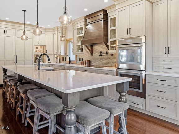 The chef's kitchen is truly the heart of the home, featuring soaring 9' ceilings, a striking 14' quartz island, dual sinks, Thermador appliances, a pot filler, an induction cooktop, and double ovens—ideal for both everyday living and entertaining. Seamlessly connected, the living room offers warmth and character with its Hearthstone wood stove and ash accent wall.