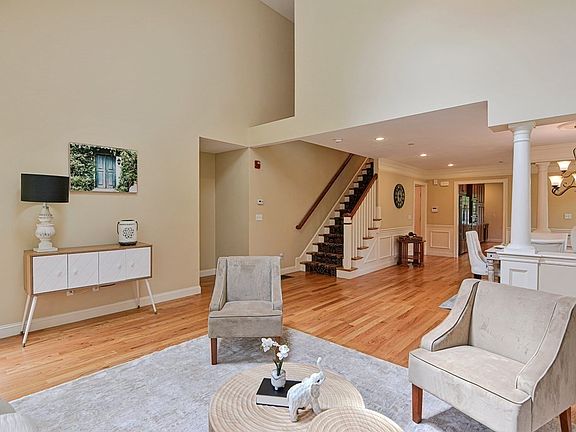 Exquisite cul-de-sac end-unit offering a blend of luxury and serenity, surrounded by meticulously maintained green spaces on historic farm grounds. Indulge in the delights of a chef's kitchen boasting ceiling-height cabinets, counter seating, a charming breakfast nook with a built-in desk, and a double sink adorned with a captivating stone backsplash. Experience culinary excellence with the convenience of a double oven and a gas range complete with a vent. Living room with vaulted ceiling, built-ins & gas fireplace. Columned dining area with picture frame and triple crown molding & medallion-suspended lighting. Oak floors & Hunter Douglas blinds. First floor primary with vaulted ceilings, walk-in, & en-suite with glass shower & dual sinks. Sun-drenched rear southern stone patio, first-floor powder & laundry rooms. Attached 2-car garage & extra sound proofing. Upstairs features two large bedrooms, shared bath, large AV room & office. Large windows & pre-plumbing for basement expansion.