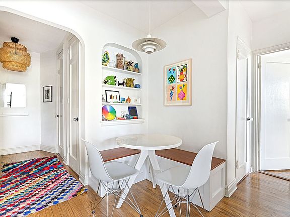 Follow a quiet entry corridor down to the spacious kitchen, living, and dining room. The room features three big, Eastern-facing windows, which let in beautiful morning light. This primary area features enough space for cooking, dining, and working from home (if need be!). Additionally, there is a separate nook, framed by bookshelves, for dining, morning coffee, evening drinks, or office needs.