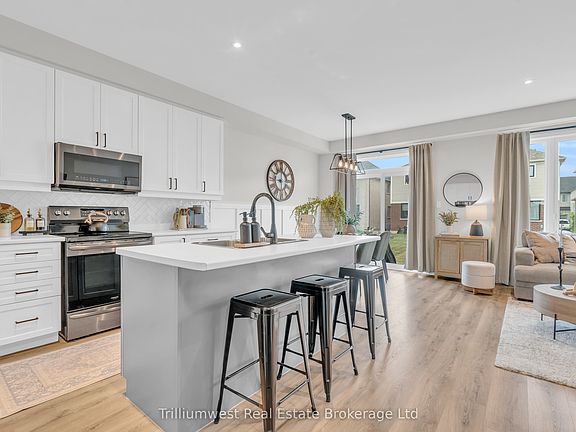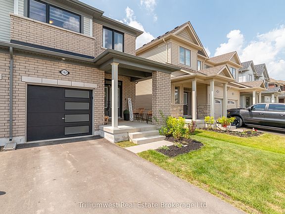 Welcome to this stunning modern semi-detached home, ideally situated in one of the most family-friendly communities. From the impressive brick façade and covered front porch to the sleek garage doors and elegant glass front entry, this home offers undeniable curb appeal. Step inside to soaring 9-foot ceilings and a stunning foyer chandelier that set the tone for the sophisticated interior. Upgraded laminate flooring and classic wainscoting lead you into an open-concept main floorperfect for both everyday living and entertaining. The stylish, yet functional, kitchen features two-tone cabinetry, black stainless steel appliances, full-height cabinets, black hardware, stylish herringbone backsplash, and an island with breakfast bar for casual dining or conversation while cooking. The kitchen overlooks a bright living area highlighted by a corner gas fireplace with above-mount electrical, ideal for a wall-mounted TV. The adjacent dining space is equally inviting with modern farmhouse lighting, wainscoting, and oversized patio doors that open to the backyard. A convenient powder room and access to the attached extra-deep single garageideal for a vehicle and additional storage or workbenchcomplete the main floor. Upstairs, an all-wood staircase leads to a thoughtfully designed second level, featuring a laundry area, two generously sized bedrooms, a beautifully updated main bathroom, and a luxurious primary retreat. The spacious primary suite includes a walk-in closet, stylish board and batten feature wall, and a spa-like ensuite with a soaker tub, vanity with champagne bronze hardware, upgraded mirrors and lighting, and a glass-enclosed shower. The unspoiled basement offers ample potential for customization, with a 3-piece rough-in for a future bathroom. Located in a welcoming neighborhood near parks, top-rated schools, the Elora Cataract Trail, and just minutes from Downtown Fergus, this move-in-ready home truly has it all.