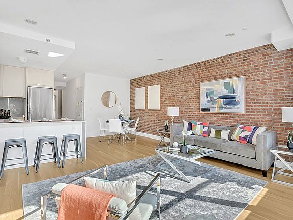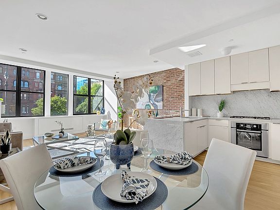 This spacious two-bedroom, two-bathroom exposed brick residence features an open kitchen and a separate dining area. The apartment is filled with natural light from the oversized windows on the west side. The kitchen is both stylish and functional, featuring luxurious White Carrara Marble countertops and backsplash, white satin finish cabinetry by KraftMaid, stainless steel cooking appliances by Bosch, a Summit stainless steel refrigerator, a Faber range hood, a Bosch dishwasher, a GE profile microwave, and an Elkay under-mounted sink with a Grohe faucet.