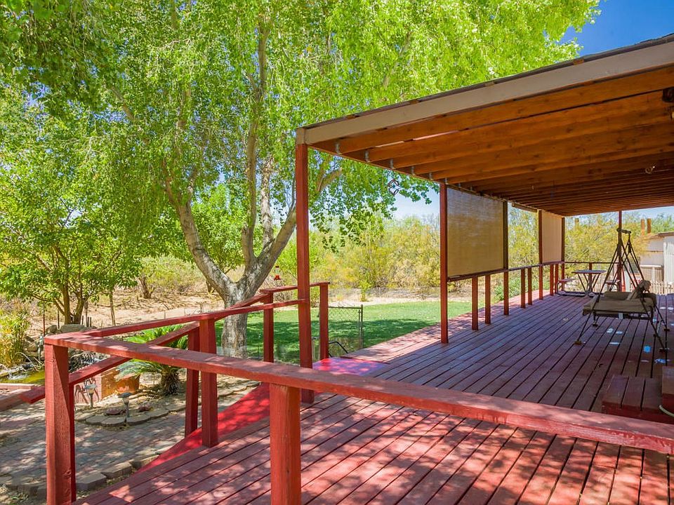 Fantastic oasis in the desert! Wonderful home on 4+ acres of flat usable land and only 0.25 mile of dirt road. Gorgeous Cottonwood, Mulberry, Ash, and fruit trees, above ground pool, pond, front and back porches, garage/workshop, 2 carports, fenced yard with grass, and Full RV hookup! Good flat land has excellent potential for horse facilities and there's already water access on the south part of the property. Home has been very well-maintained and has 3 bedrooms & 2 baths, nice kitchen with island, formal dining room (used as a den), and a large family room with a stone fireplace. There's plenty of space and lots of covered parking. Beautiful views and quiet, private location!