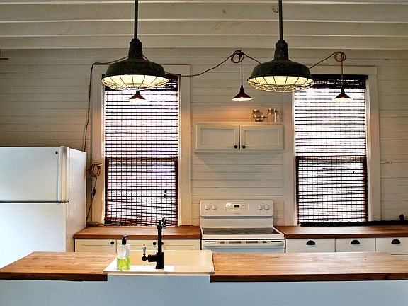 Butcher block counter topsCinder-block fire ringExterior doorsFridge and range stayWooden back deckIkea kitchen cabinets