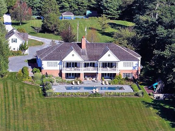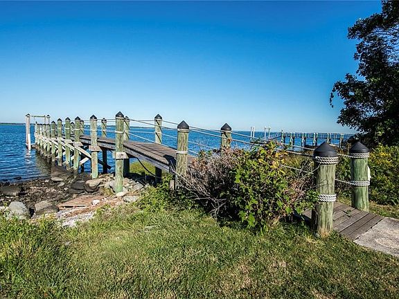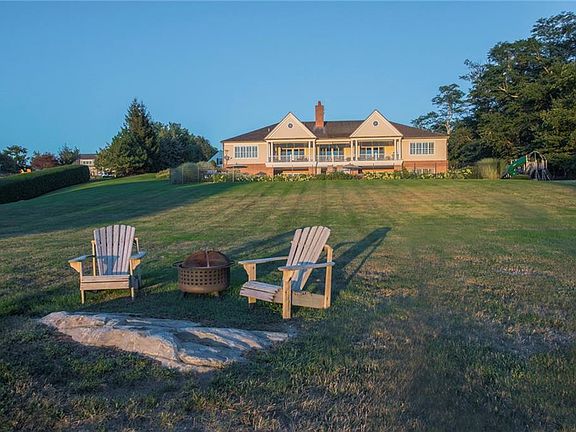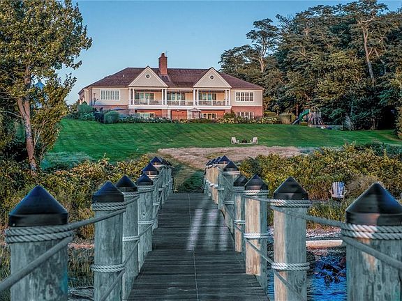This custom Georgian estate home on Narragansett Bay offers commanding sunset views, pool, dock, carriage house, mooring and tennis court with viewing stand. Set on 3.9 waterfront acres at the end of a dappled sunlit road, this big beautiful property takes full advantage of its scenic location. The upper and lower levels provide "just right" space for extended family visits. Upstairs, the main house has a gracious entry foyer, large gourmet kitchen, living room with fireplace, office and large covered porch all facing the stunning water view. His and her bathrooms adjoin the master suite which enjoys glorious views of the Bay. A second ensuite bedroom, library and laundry room are also on the main floor. Downstairs there's room for everyone with 6 additional rooms including big, cozy great room with fireplace and spacious dining area, 2 full baths and separate laundry. From the great room, sliding doors open to a covered patio and pool. Just down the hill a rocky beach and dock await. A stand-alone carriage house contains garage bays with finished 2nd story. Grands, teens and associated grown ups will surely make memories in this very special place. If your vacationing needs range from compound to cottage this could be the house for you.